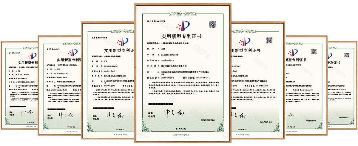 经过多年的研发创新,湖州开森现拥有【一种便携式散粉盒结构】、【一种多功能化妆品易揭纸卡结构】、【一种方便携带的纸卡式粉饼结构】、【一种双腔混合挤出型化妆品易撕包】、【一种双腔掰折挤出型化妆品掰折打开片】、【一种单腔掰折挤出型化妆品掰折打开片证书】等多种专利,可以根据客户的不同需求,进行深度创新,满足市场和产品日益更新的需求。