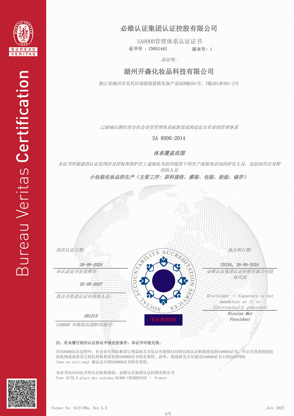 SA8000管理体系认证证书