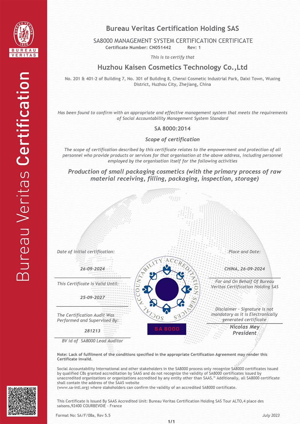 SA8000 MANAGEMENT SYSTEM CERTIFICATION CERTIFICATE
